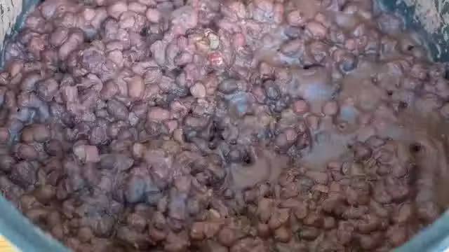 3、你看,紅豆已經完全煮爛了,趁熱馬上取出紅豆加200克食用油,200克麥芽糖,麥芽糖比較硬,未開蓋前可以放入熱水裡浸泡一下,浸泡後很容易倒出來,300克白糖;