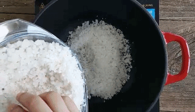 3.粗鹽先放入鍋內墊底,鹽的範圍大小就以能放雞下去不讓雞跟鍋底接觸就好,大概2厘米厚。(以前小編鹽焗的時候會先把鹽炒熱,但後來實踐發現不炒也沒影響,所以偷懶了)