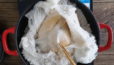 6.開蓋,撥開頂上的鹽。香香的雞,噹噹當~好誘人。