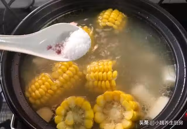 烹飪第四步:大概燉一個小時,加上少許食鹽,雞精少許,其他調味品,轉小火燉30分鐘,等待湯汁乳白就可以出鍋了。