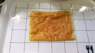 把醬汁塗抹在豆皮上,貼上一片豆皮再塗上醬汁。重複做完。然後對摺,用竹籤/牙籤封口