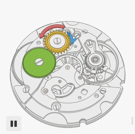 小鋼輪逆時針轉動讓我們能夠給主發條上弦,而當我們嘗試將其向相反方向轉動時會發生什麼。在下面的模擬中,請注意小鋼輪的齒是如何被止逆棘爪卡住,從而阻止了小鋼輪旋轉的: