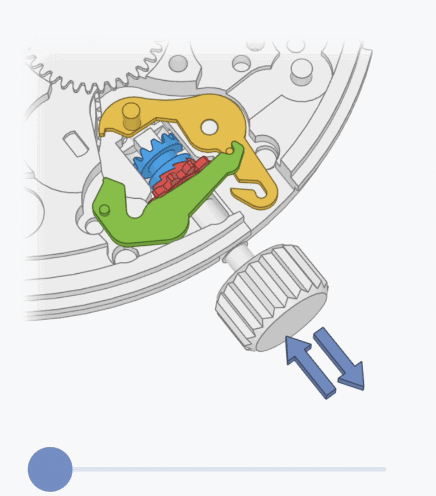 讓我們隱藏其他部件,單獨觀察——當我們推進和拉出錶冠時,拉檔和活動機發生的錯綜複雜的聯動:
