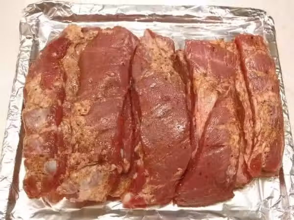 烤盤上鋪上鋁紙,把豬肉放在盤上(皮向下),烤20分鐘。