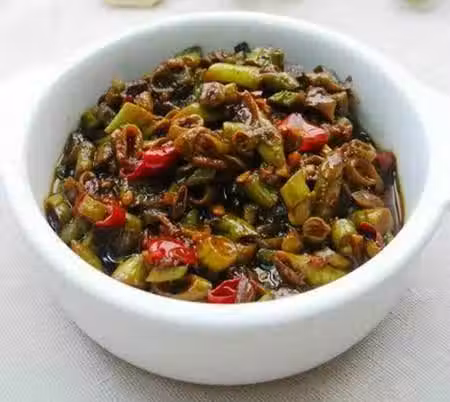 食材:豆角200g、干辣椒3個、蒜2個、姜適量、豆瓣醬適量、甜麵醬適量、油適量