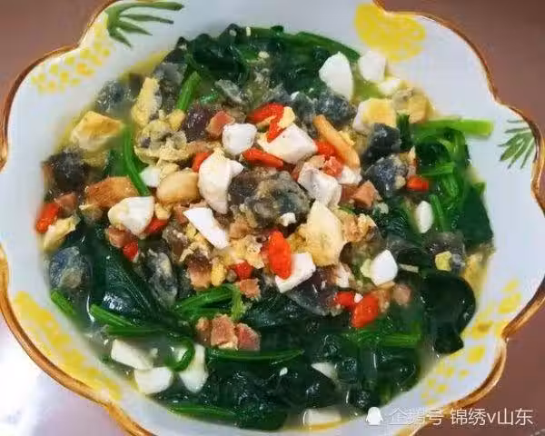 食材清單:1、準備洗凈的菠菜一把,放入盆中備用,生薑一小塊切成薑末,放入盆中,大蒜幾粒拍扁切成蒜末,和薑末放在一起,煮熟的鹹鴨蛋一個,先剝去外皮,把蛋黃和蛋清分別切碎,一起放入小盆中,小米椒一個切成細圈,放入盆中用來配色。