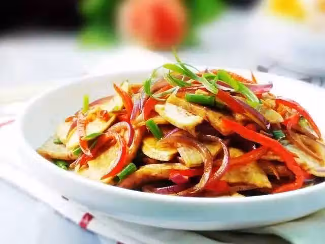 4.鍋中留底油,炒得姜蒜,加入洋蔥絲和紅椒爆香