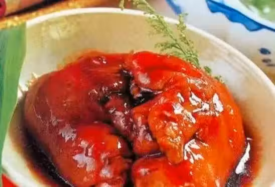 3.將豬蹄抹勻老抽,晾乾下油鍋煎炸皮面,糖色固定即可,另起油鍋將蔥姜爆香後,投入豬蹄,加好料酒兩大勺,冰糖或砂糖兩勺高湯沒過原料,適量鹽,醬油,味精,燒開收汁,小心將豬蹄托出碼大盤內,余汁澆在上面即可。