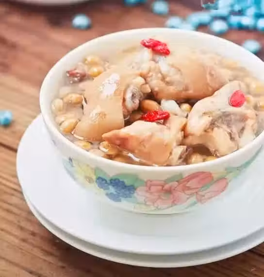 豬腳500克,黃豆50克,姜、蔥花、鹽適量。