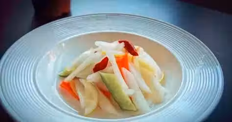 白菜(三片)、胡蘿蔔(小半根)、青檸檬(兩片)、檸檬(兩片),鹽(5g)、蔥油(適量)、洋蔥(小半個)、糖(50g)、白醋(60g)、干紅辣椒(兩隻)。
