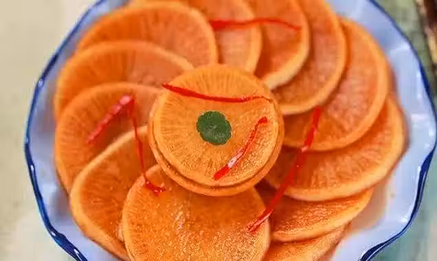 3. 腌制20分鐘,白蘿蔔片變軟,會滲出汁液,倒掉。在放入剩餘的鹽和糖腌制20分鐘,倒掉滲出的液體。