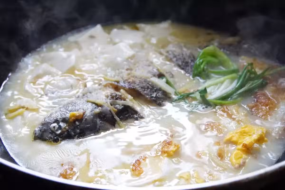 7、開中火,讓魚湯滾沸約8分鐘,至湯色奶白;