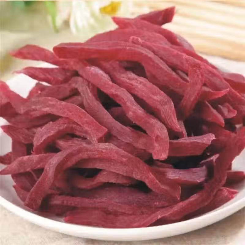 2、晾涼後,剝去紫薯皮,用刀切成1CM寬的長條,並整齊地擺放在微波的轉盤上;