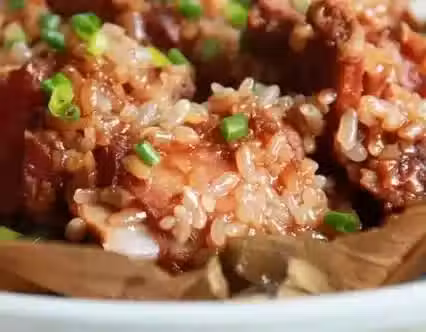 3封口朝下放入蒸鍋中,冷水入鍋,水開後大火蒸15分鐘,再轉成小火蒸2個小時。(小火蒸的時間可以縮短,但我為了排骨軟爛,糯米能更加融入排骨的味道,所以蒸的時間比較長,一般40分鐘能保證排骨和糯米都熟了);
