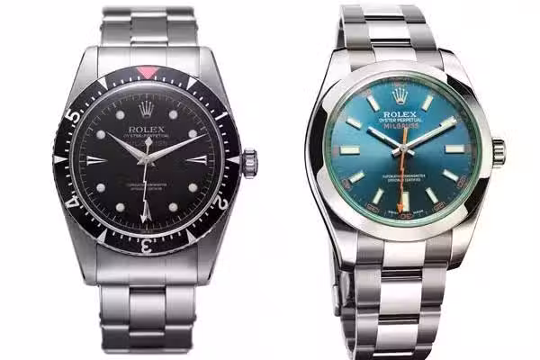 MILGAUSS腕錶1956年版本(左)、2014年電光藍版本,綠水晶鏡面、防水100米(右)