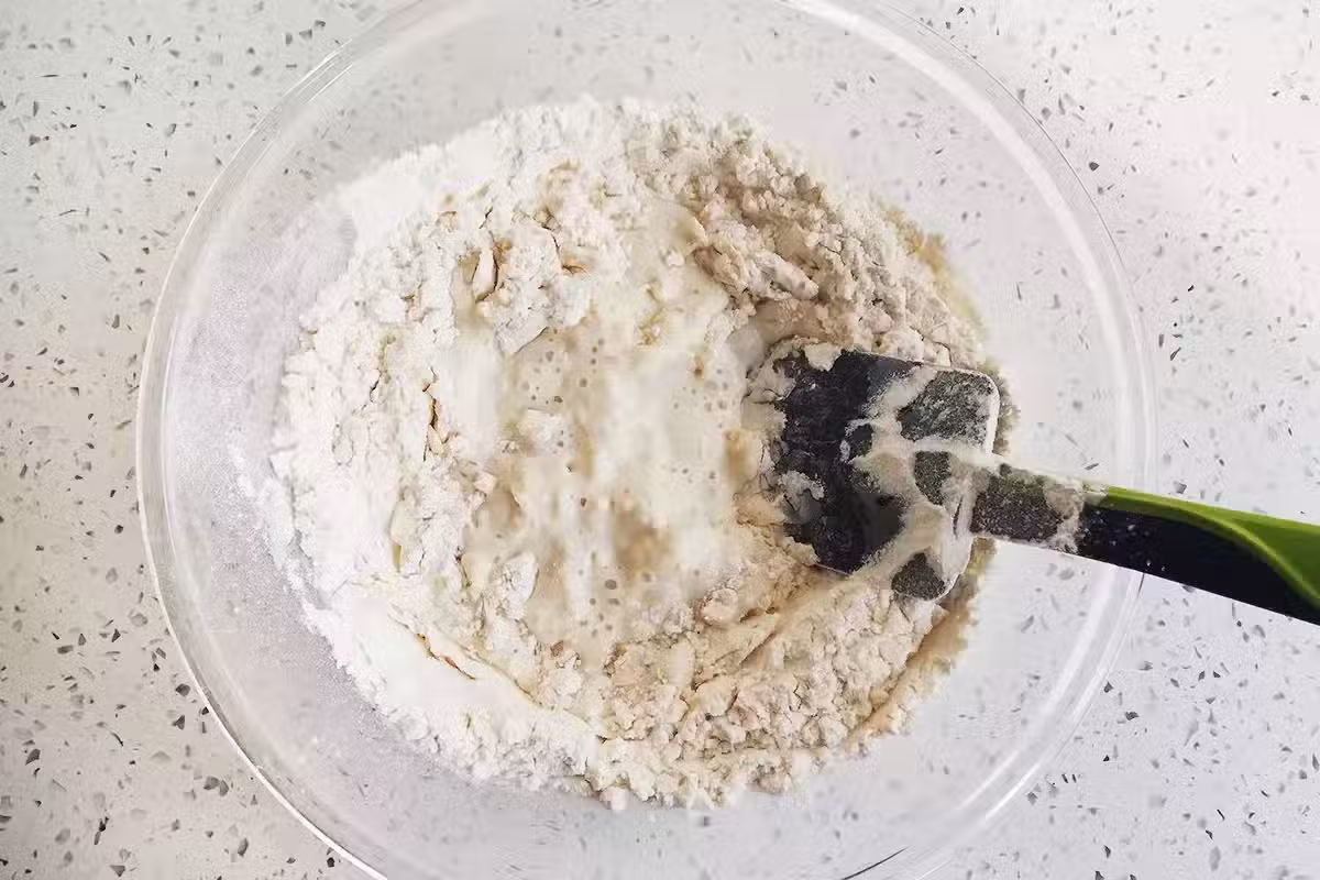 步驟2:將牛奶和酵母的混合液,倒入高筋麵粉中,然後用刮刀翻拌均勻。