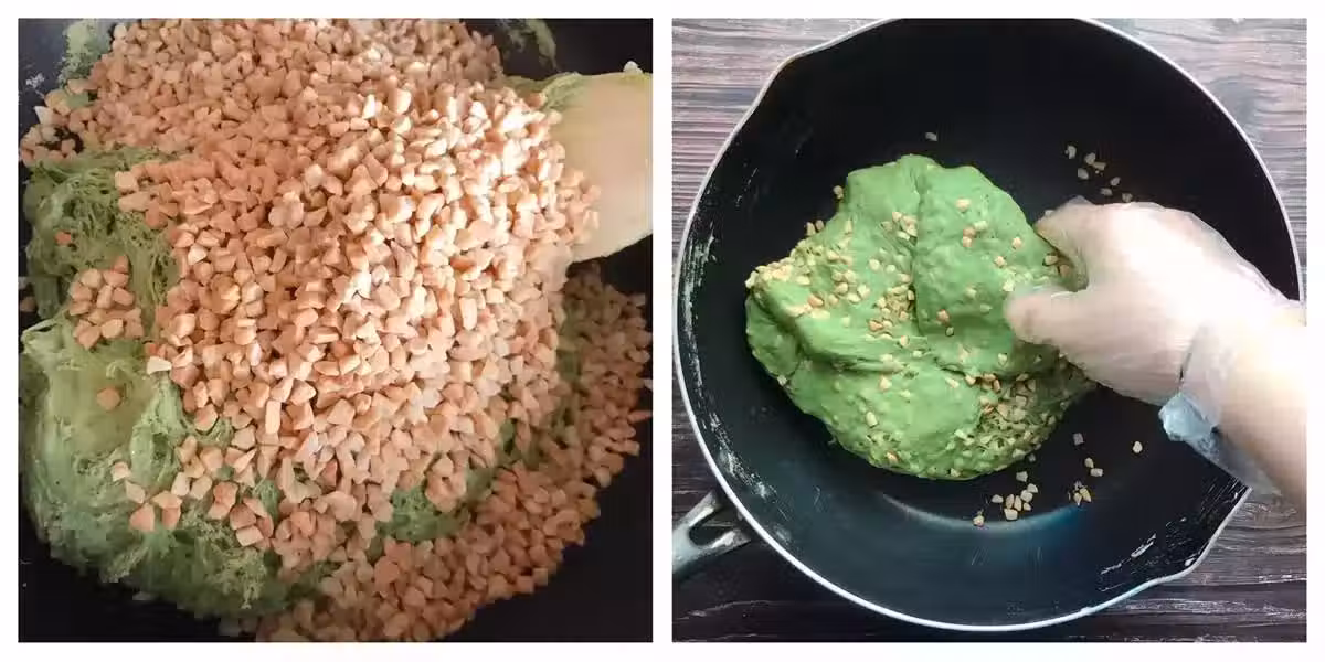 4、趁著糖團有溫度的時候將它放入牛軋糖模具中塑性,等徹底涼透後脫模取出切成小塊即可。