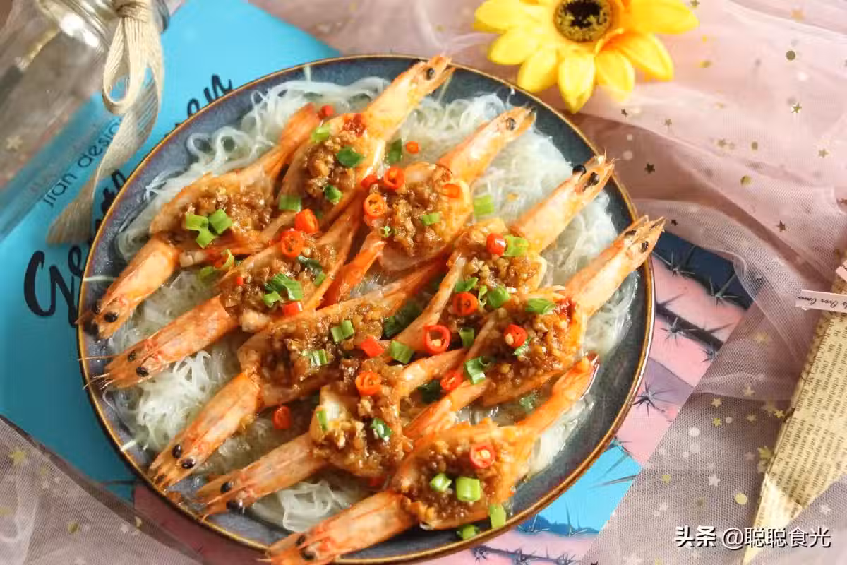 4、把處理好的開背蝦放在粉絲上面,蝦背朝上。