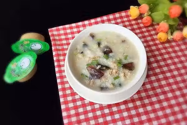 皮蛋4個、肉沫200g.大米大半碗.香蔥2棵、家樂濃湯寶1塊、雞精1匙、鹽少許、食用油適量