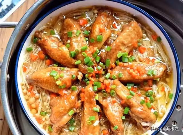 雞翅中5個、金針菇1把、生抽20克、蚝油20克、黃酒10克、鹽2克、姜1塊、澱粉30克、香蔥少許、紅辣椒少許。