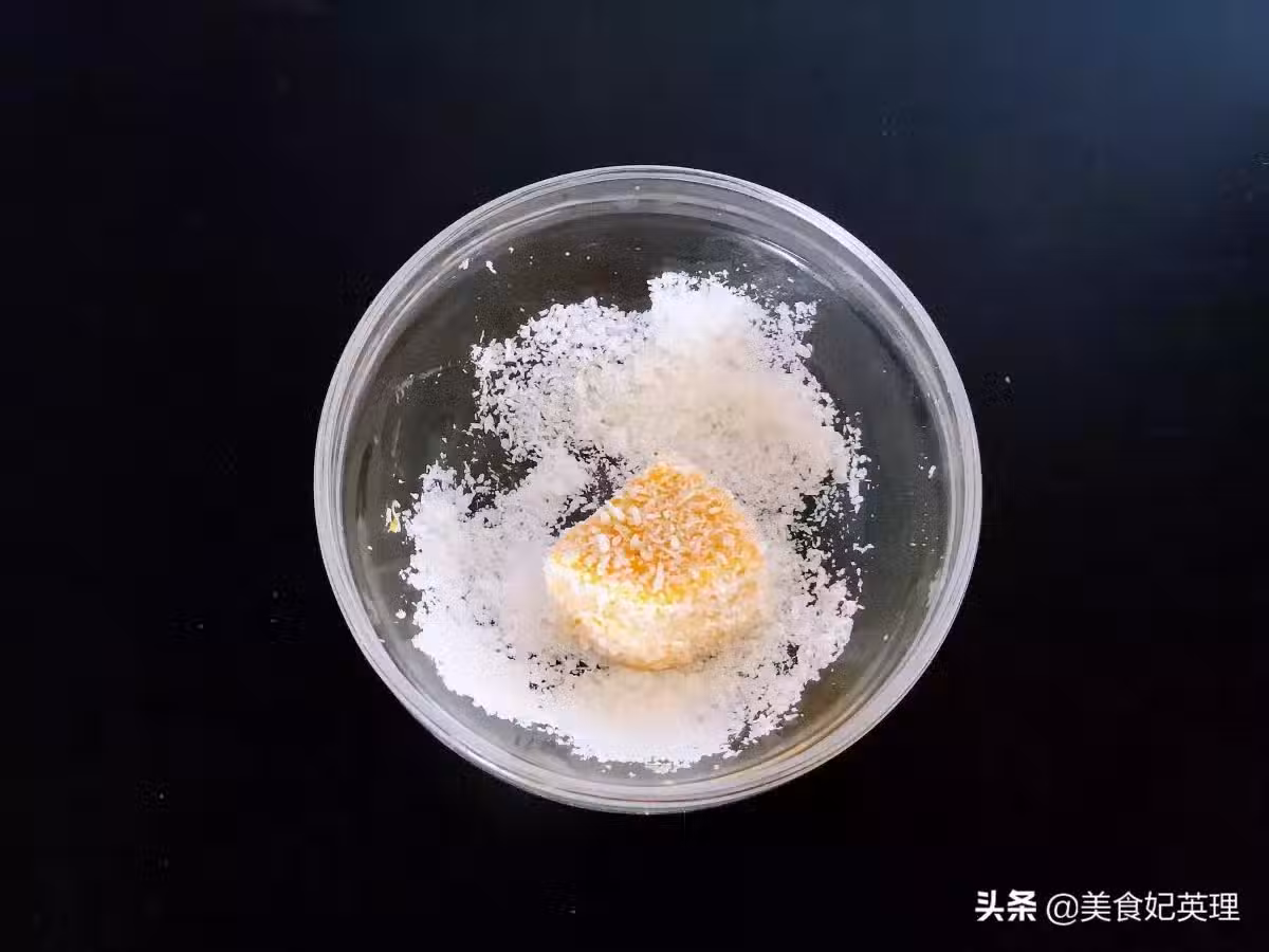 7.南瓜糕從冰箱取出切塊,在椰蓉中滾一圈,完成