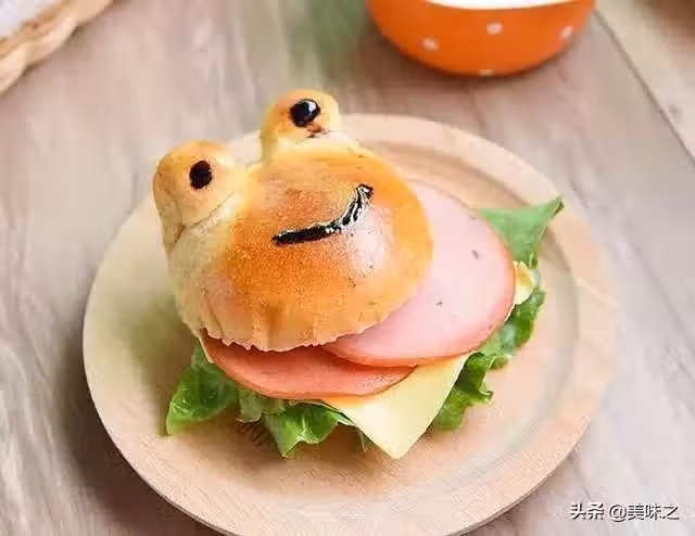 8、在麵包胚上塗抹沙拉醬,夾入火腿片、生菜和芝士片,然後用巧克力畫一下青蛙的眼睛和嘴巴即可。