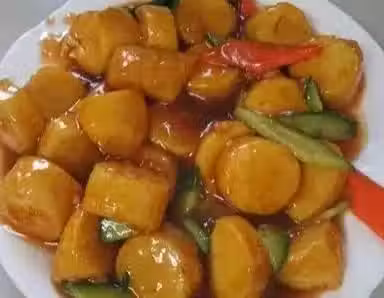 日本豆腐3條;干香菇8朵(切成2半);蔥,蒜適量(切末);澱粉50克左右;生抽,蚝油適量;糖,雞精各1小勺