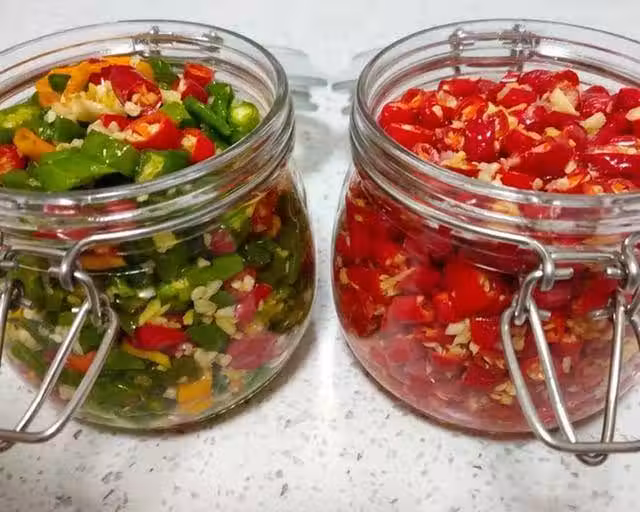 辣椒連著辣椒蒂一起洗乾淨,生薑洗凈,控幹水分。