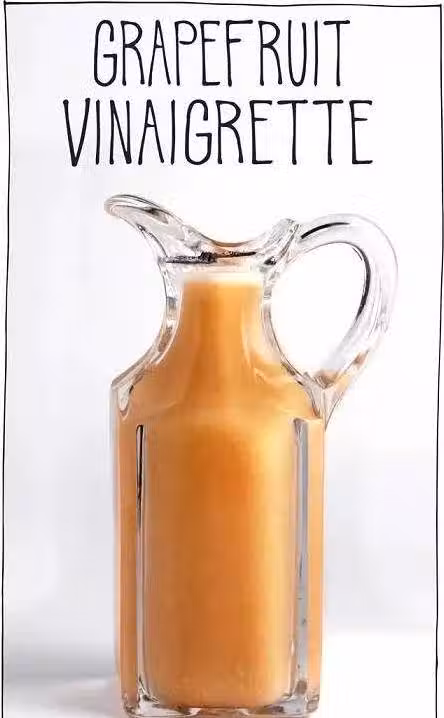 食材:葡萄柚汁100ml、菜籽油50ml、黃芥末粉10g、龍舌蘭糖漿或楓糖漿15g、鹽少量