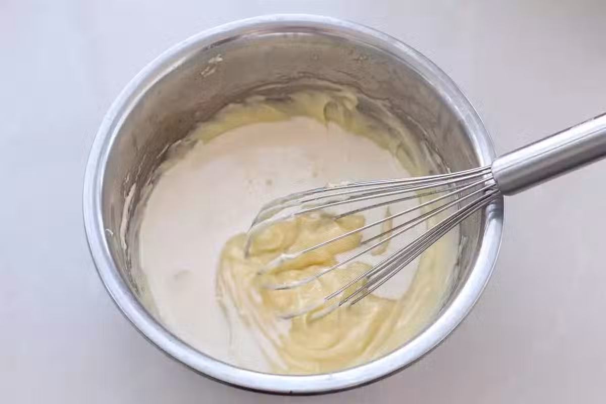 4.然後將雞蛋分兩次加入,混合攪拌均勻。