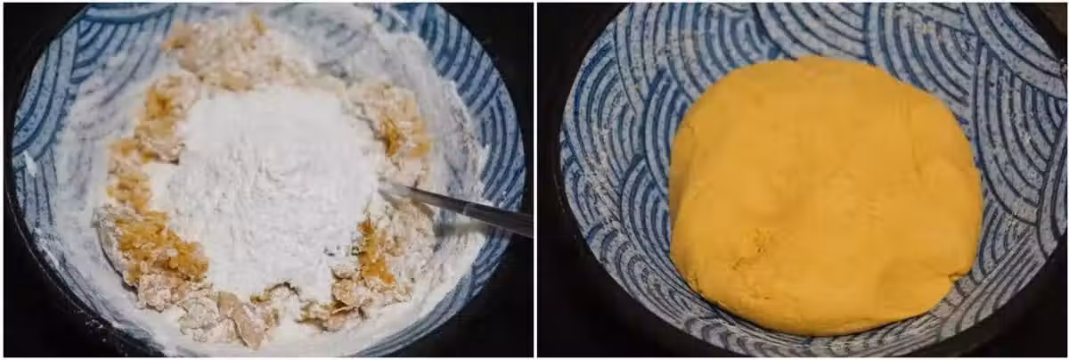 2.加入糯米粉,這一步就不能太隨便了,雖然說沒有規定用量,但是我們要做的麵團程度是必須掌握好的。大家可以看到,這個麵團是非常軟的,並且是成型,不會乾裂的程度,也不會粘手,手感是咱們耳垂那個軟度,可以自己摸摸耳朵,感覺一下。所以說,糯米粉不要一股腦放進去,如果不夠成型再繼續加。
