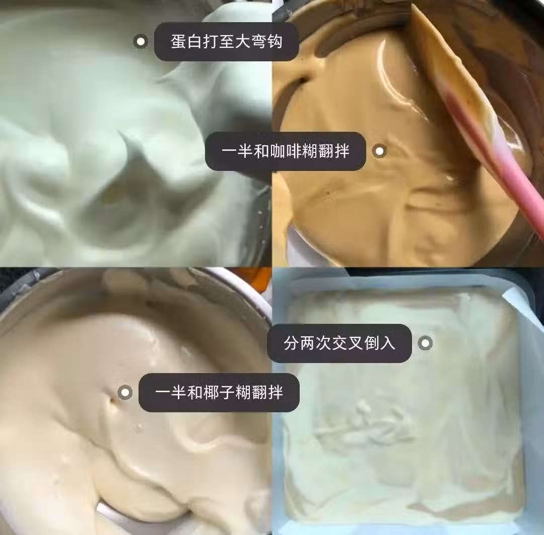 5.】先把一半咖啡糊從高處倒入模具中,然後一半椰子糊,再倒剩餘的咖啡糊和椰子糊,用刮刀從底部往上隨意翻拌幾下,震出大氣泡