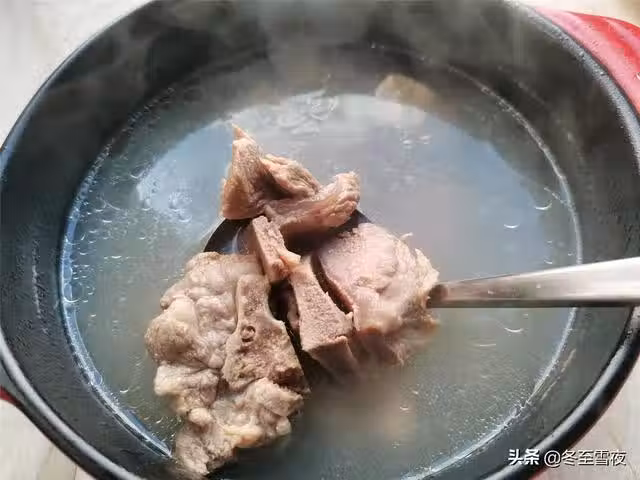 砂鍋內加入水燒開,下入焯好水的豬骨頭,再加入薑片,蓋上鍋蓋,大火燒開,轉小火煮1小時。