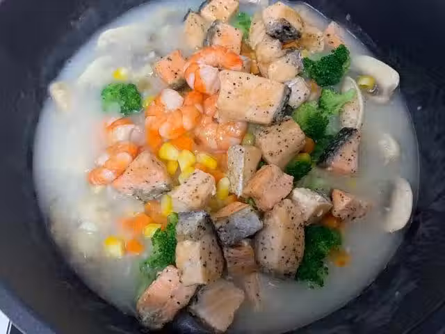 6、放入麵粉水煮至濃稠,再加入玉米、胡蘿蔔、西蘭花、三文魚、蝦仁炒勻。