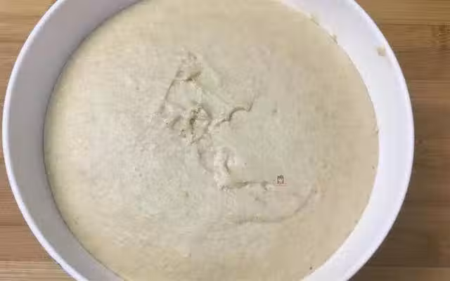 3、醒發好的面一看就是非常的蓬鬆,用筷子挑起來的面全是小小的氣泡,這就可以了。然後還是用筷子順著一個方向用力地攪,相當於揉面,排除面里的空氣,使面上勁。