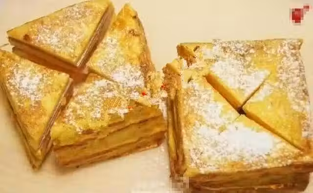 7、為方便食用,把土司切成4塊,可以在表面撒上白糖粉。