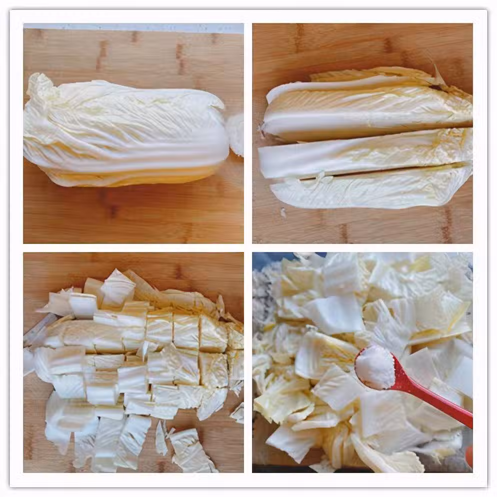 2、切好的白菜放在一個大盆中,加入2勺食鹽,翻拌均勻,腌制1小時,殺出白菜中的水分,白菜切得塊狀比較大,需要腌制的時間比較久;