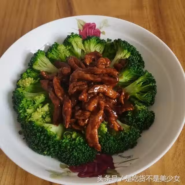 西蘭花半個;無公害豬精瘦肉300克;蚝油一大勺;醬油一小勺;鹽少許;生薑適量