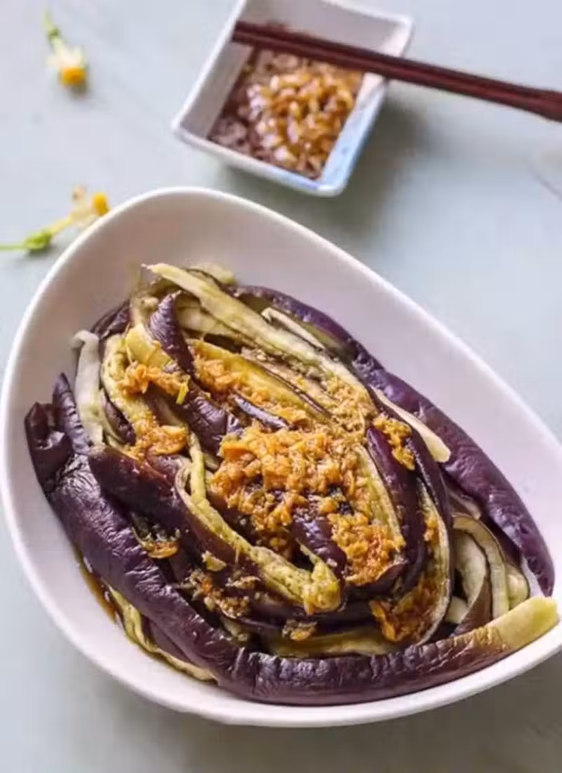 3. 蒸熟的茄子撕成長條,放入大碗中,倒入調味汁即可。