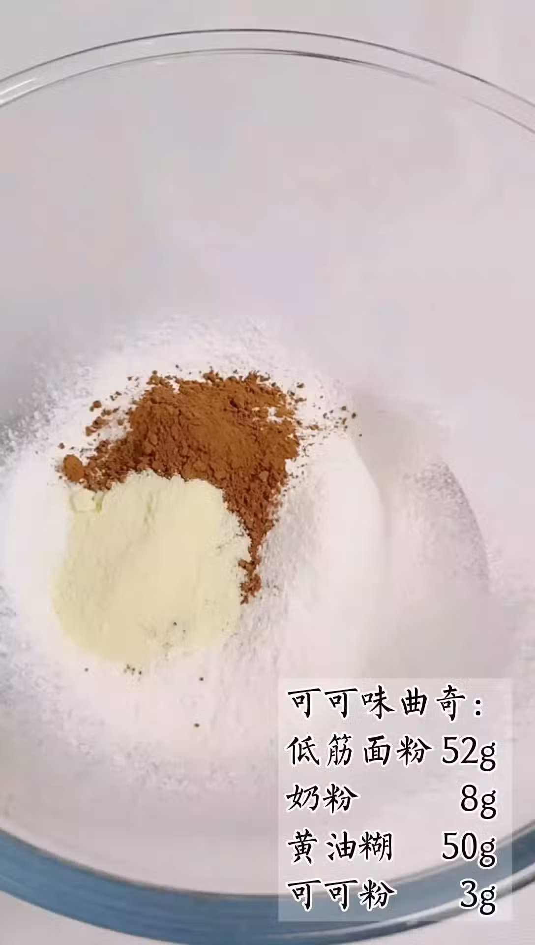 步驟8:可可味曲奇:低筋麵粉52克,奶粉8克,可可粉3克,黃油糊50克