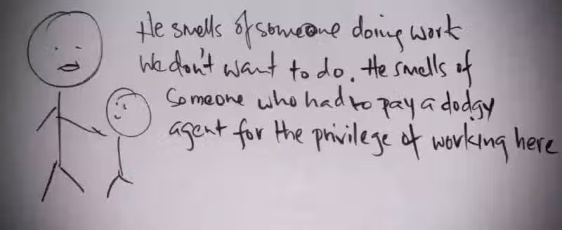 爸爸:「他身上的味道,也許是某個人 做了我們都看不上的工作的味道,也許某一個人很努力去支付能來這裡工作的 中介費的味道。」