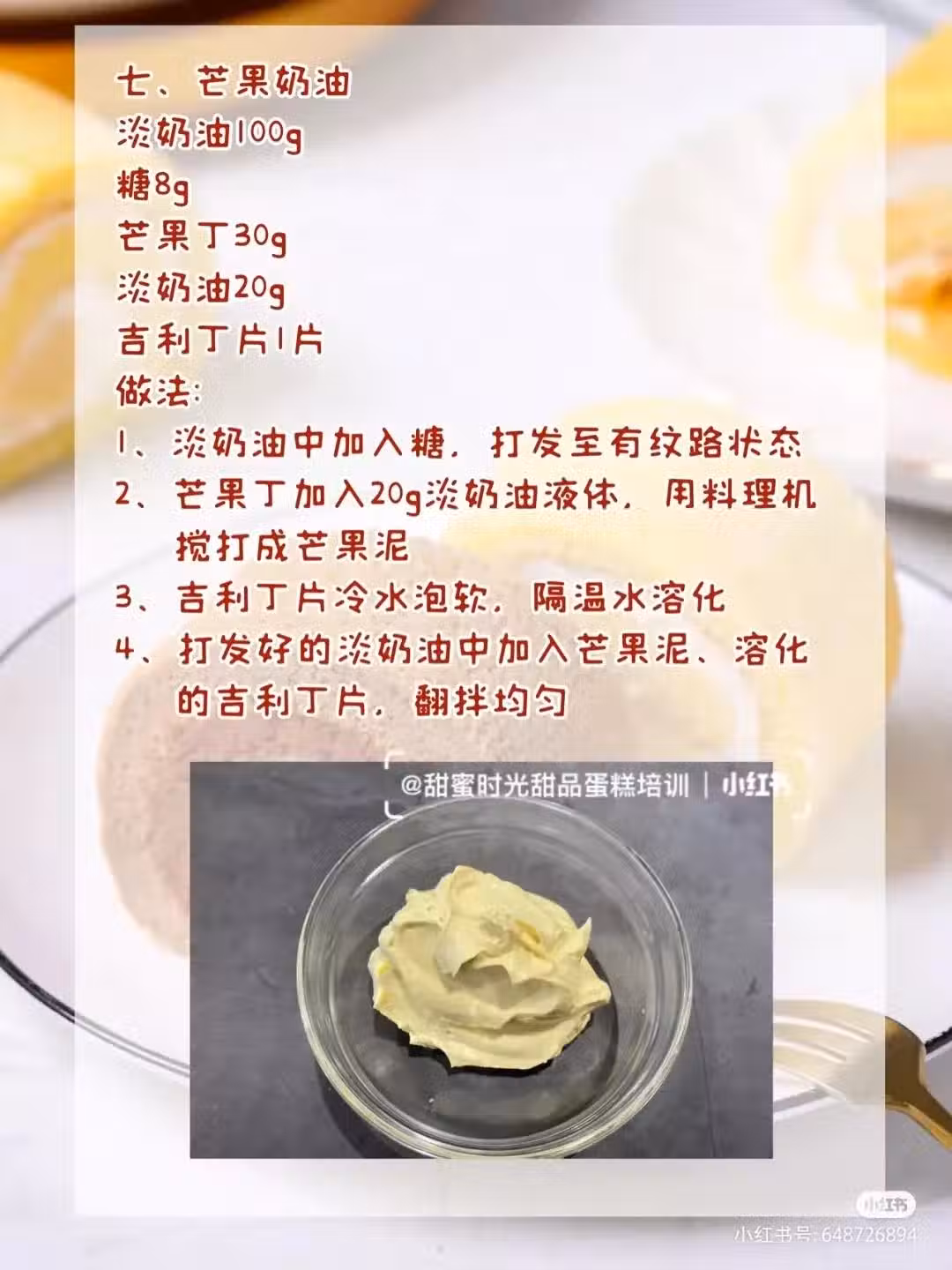 淡奶油100g 糖8g 芒果丁30g淡奶油20g 吉利丁片1片