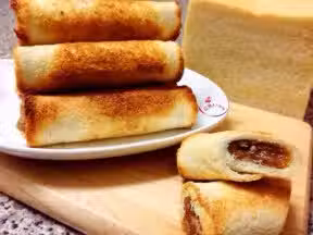 4 捲起麵包,在另一端放一些年糕碎當黏著劑,把開口黏起來