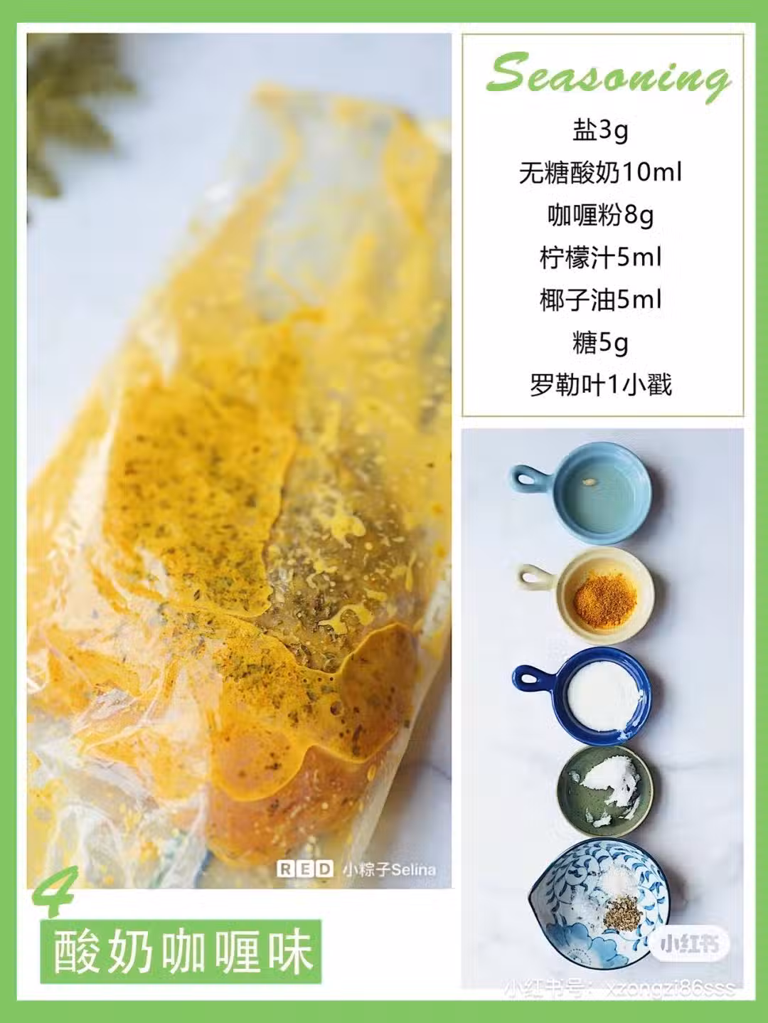 鹽3g 無糖酸奶10ml 咖哩粉8g 檸檬汁5ml 椰子油5ml 糖5g 羅勒葉