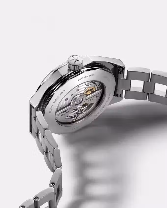 ZENITH 真力時 DEFY 系列 Revival A3690 復刻版腕錶精品店特別款配備了透明藍寶石底蓋搭載 Elite 670 型自動上鏈機芯