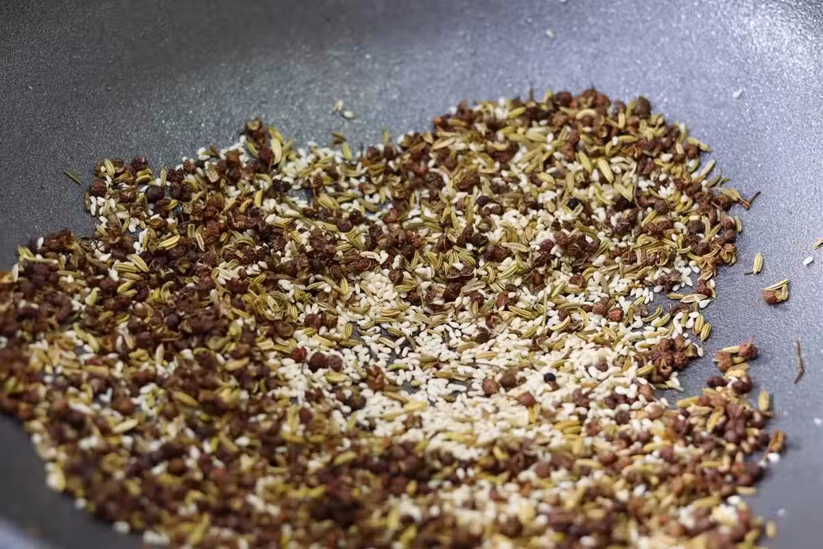 4、將香料都炒好後我們盛出來放在案板上晾涼,之後我們可以用擀麵杖將香料碾壓成粉狀,或者用料理機直接打碎,如果有沒有打碎也不用介意,我們可以直接留下並不影響。