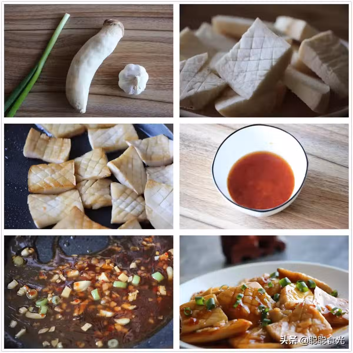 【操作步驟】1、把杏鮑菇沿著縱向切成厚片,然後用刀在一面輕輕划上花刀。注意不要切太深。