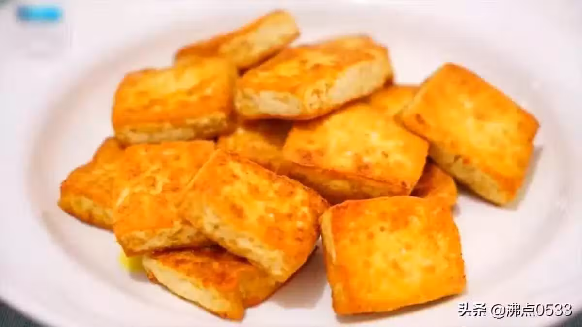 4、鍋中加油,燒至7成熱,放入豆腐塊煎至兩面變金黃,裝盤。