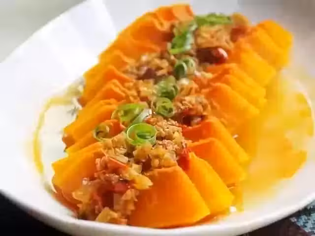 南瓜300克、紅椒1大勺、蒜2大勺、蔥1大勺、薑1小勺、高湯1小勺、生抽2大勺、香油1小勺、水2大勺。