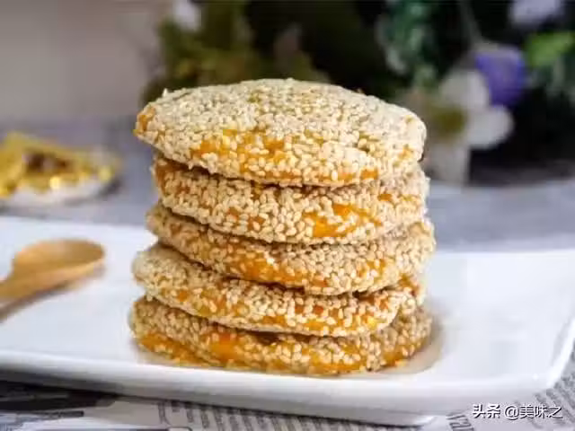 3、包入綠豆沙餡,壓扁蘸上芝麻